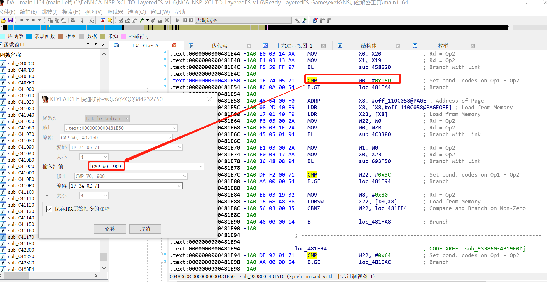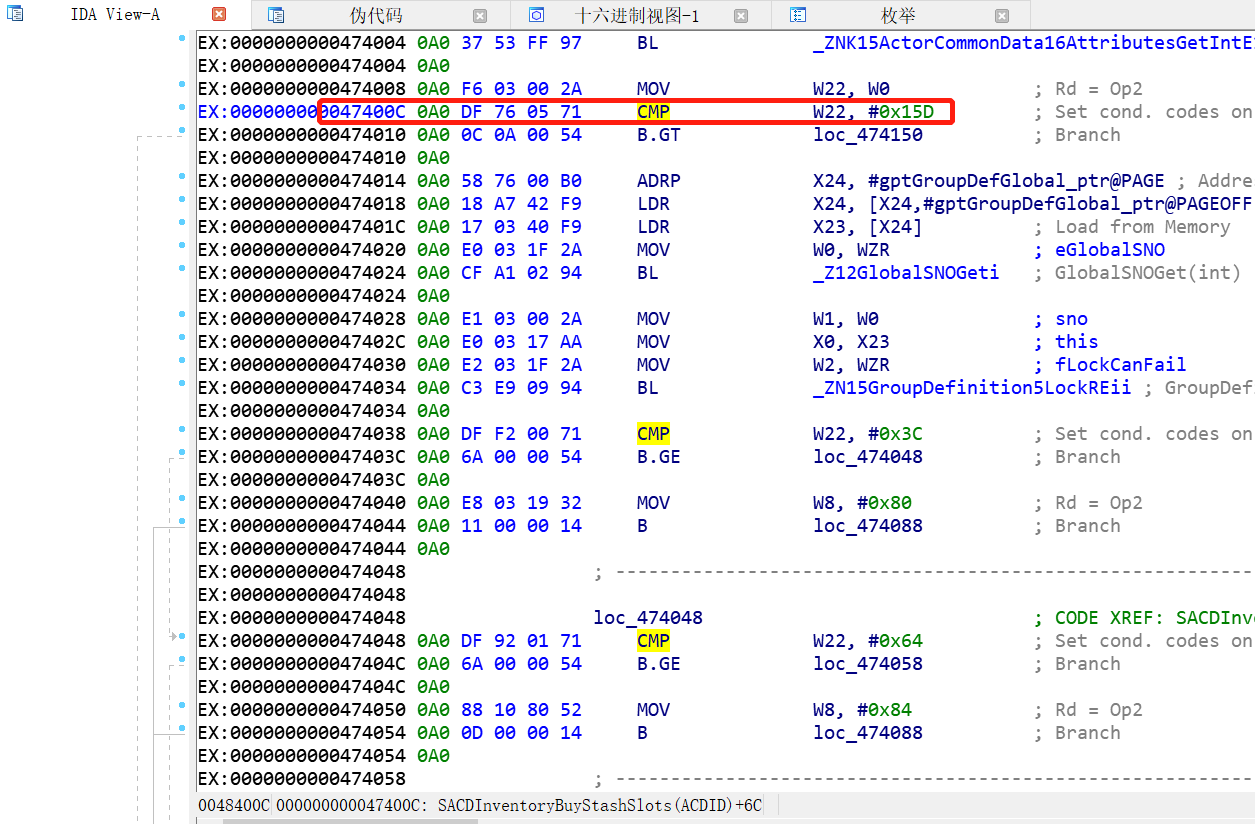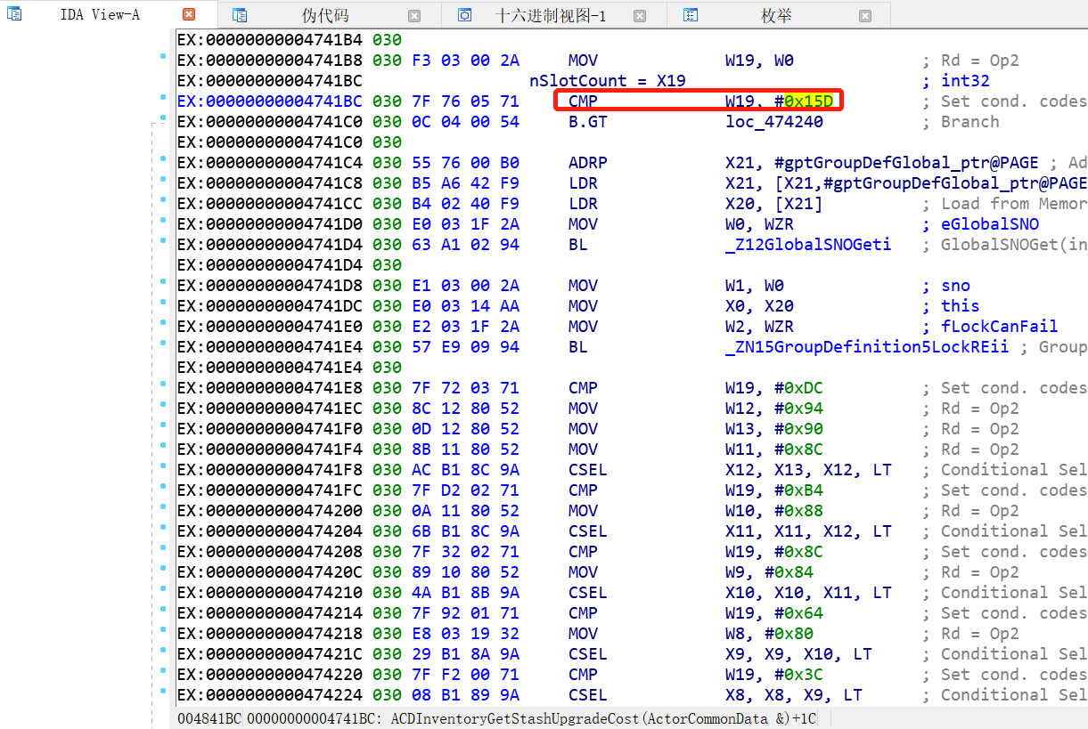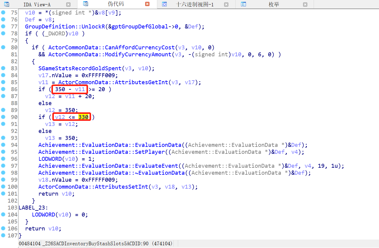 7. 知道了储藏箱上限,接下来就简单了,我们搜索maxstash,发现函数ACDInventoryGetMaxStashSlots,双击打开,发现默认上限是350,找到2.6.6的地方,Hack掉