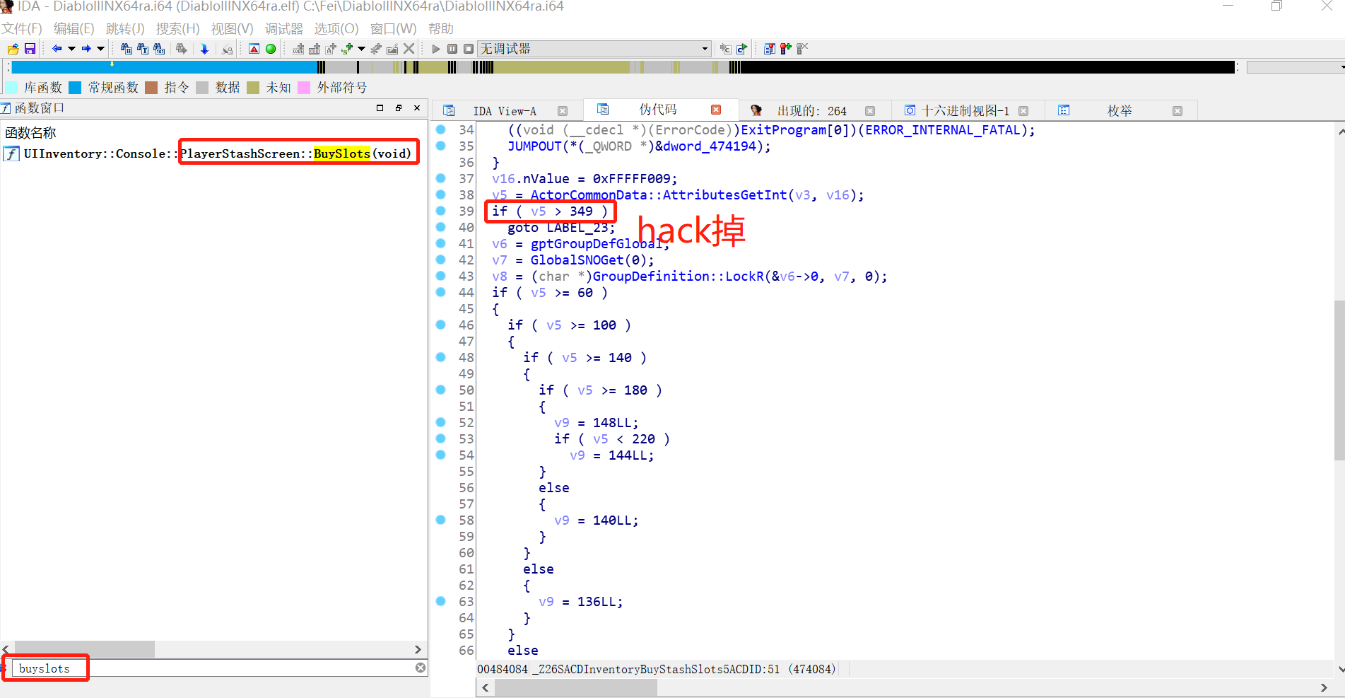 8. 接下来我们hack购买储藏箱仓位的函数,搜索buyslots, 发现了SACDInventoryBuyStashSlots,打开,找到要hack的地方,一共有三处,我们最后找到2.6.6对应的三处地址修改之