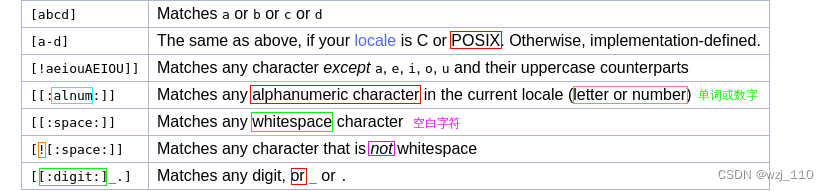特殊的'shell'通配符: 1) 使用'{花括号}'{a..c}、{a,b,c} --> '其他语言也可以使用' -->'brace'扩展案例1: ls {"au",[bc]}* --> 列出以 'au','b','c' 开头的文件案例2: ls init*[a-z] --> 列出所有文件中'以 init' 开头,'英文结尾'的文件2) ~'家目录'、 -'之前目录'3) POSIX风格 --> [::] '专用字符集' 和 [[::]] [:alnum:] --> 任意'数字'或者'字母'[:alpha:] --> 任意'字母'[:space:] --> '空格'[:lower:] --> '小写'字母[:digit:] --> 任意'数字' --> {0..9}[:upper:] --> 任意'大写'字母[:cntrl:] --> 控制符[:print:] --> 可'打印'字符[:punct:] --> 标点符号[:xdigit:] --> 十六进制数[:blank:] --> 空白字符案例: ls [[:lower:]]*[0-9]* --> 匹配以任意'小写字母开头','中间包含数字'的文件4) !:'排除'文件,如!a.js表示'排除文件a.js' -->'其他语言的glo也支持'5) \x:匹配字符x,用于'转义'符号细节: 通配符的过程中可能会遇到'文件名中'包含了'特殊(空格或*之类)'字符,用'单引号'包括