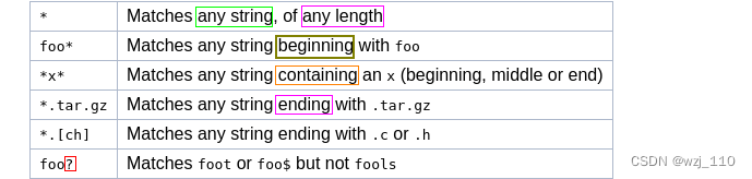 1) *:匹配一个路径部分中'0个或多个'字符2) ?:匹配'一个'字符shell glob模式: '*' 可以匹配除了'/以外'的任何东西,"?" 可以匹配除了"/"以外的任意字符3)[]:匹配'字符集中的单个'字符 -->'[方括号]'注意1: 在[^…]和[!…]表示匹配'不在列表中'的字符,如[^abc]匹配除了a, b, c以外的字符注意2: 包含在[]中的字符'只会'被匹配一个,并且[]里面'不可以为空'注意3: []里面可以包含[,],!,?,*,\这些'特殊'字符,需要'转义'注意4: 可以使用横杠'-',例如:[a-z]需求: 如果要匹配'-',则可以把-放在'前面'或者'后面'比如: [-a0-9]匹配-,a,0到9中的'任意'字符如果要匹配!,则需要进行转义4) 补充: 上面所有通配符只匹配'单层'路径,不能跨目录匹配,即'无法匹配子目录'里面的文件--> 或者说'?或*'这样的通配符,'不能'匹配路'径分隔符(/)'5)**:代表'0或多个'层级的目录,匹配所有'文件、目录、子目录、子目录下的文件'案例: 比如'a/**/z' 可以匹配 'a/z'、 'a/b/z' 或 'a/b/c/z'等ls */*.txt --> 要'匹配子目录(一层)'里面的文件补充:bash version >= 4.0 shopt -s globstar确认globstar打开,否则'**'会被翻译成*使用重点: 不同语言的 glob 库支持的规则会'略有不同'