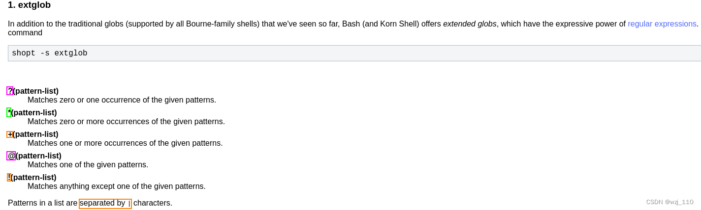 1) dotglob: bash在'文件名扩展'的结果中包括'以点(.)开头'的文件名2) extglob: 打开扩展的模式匹配特性,'正常的表达式元字符'来自Korn shell的文件名扩展[1]、shopt -u extglob --> '关闭'extglob shell选项[2]、shopt -s extglob --> '打开'extglob shell选项3) nocaseglob: 如果设置,当执行文件名扩展时,bash在'不区分大小写'的方式下匹配文件名4) nullglob: 如果设置,bash允许没有匹配任何文件的文件名模式'扩展成一个空串',而不是他们本身理解: GLOBIGNORE'变量'解读: GLOBIGNORE allows you to 'specify patterns' a glob 'should not match'