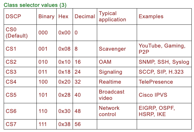 - 类选择器DSCP,定义为向后与IP优先级兼容,值为(8,16,24,32,40,48,56);