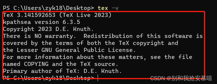 我们打开终端,输入:tex -v 下面是这样代表我们的环境变量没有问题
