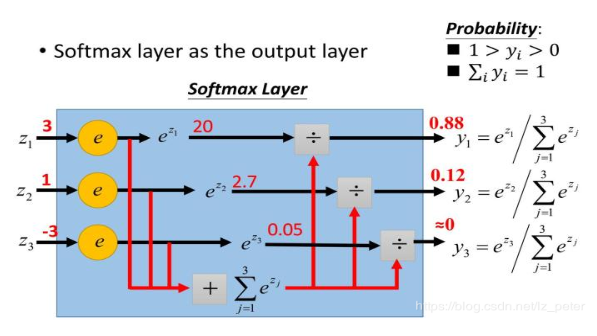 指数函数的值域是(0,∞) 。与概率取值相似的地方是它们都是非负实数。这样就可以利用指数函数将多分类结果映射到零到正无穷。然后进行归一化处理,便得到近似的概率。