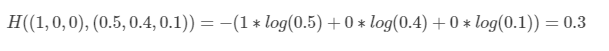 例如有一个三分类问题,某个样本的正确答案为[1,0,0],某个模型经过softmax回归的预测结果为(0.5,0.4,0.1),那么它和正确结果的交差熵为: