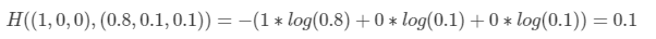 但另外一个模型的输出结果为(0.8,0.1,0.1),则预测值与真实值的交差熵为: