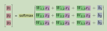 softmax把输入值当成幂指数求值,再正则化这些结果值。这个幂运算表示,更大的证据对应更大的假设模型【hypothesis】里面的乘数权重值。反之拥有更少的证据意味着在假设模型里面拥有更小的乘数系数。假设模型里面的权值不可以是小于0的数值。Softmax会正则化这些权重值,使它们的总和等于1,以此构造一个有效的概率分布。
