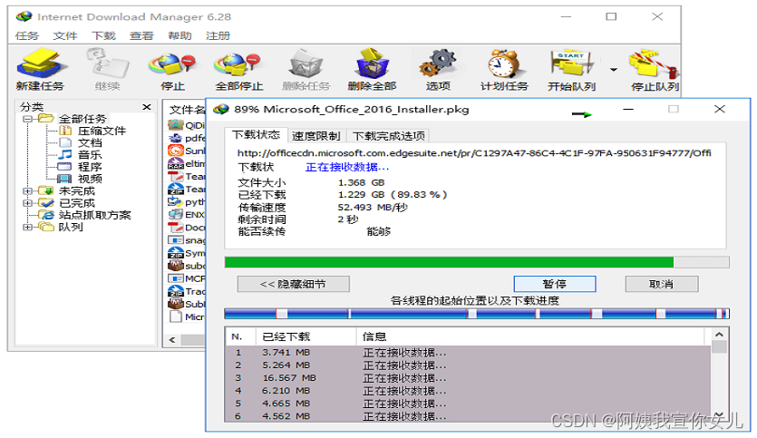 1、IDM的下载速度:IDM支持多线程下载,最高支持32线程同时下载。举个例子:我设置8线程下载,就是将我要下载的文件划分成8个部分,每个部分会同时下载,就相当于原先下载一次的速度×8倍,基本可以跑满你的带宽,最后将这8个部分再拼接成一个完整的文件,即完成下载(小编建议量力而行,不是说线程越高越好的,线程数越多,就会分得越细,如果是大文件,拼接的时间就会很长,并且这个线程数还取决于你的网络,一般8线程就可以跑满你的带宽了,调高了也用不上了。因为小编我的网速不快,一般调到4就可以跑满了)。下载速度达到10MB/s以上很简单,速度是真香。