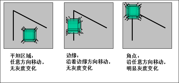 角点定义:窗口向任意方向的移动都导致图像灰度的明显变化。