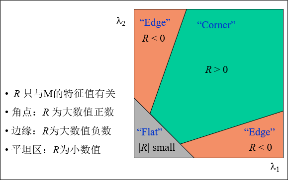的特征值提供关于给定位置的边缘的信息。如果给定位置的矩阵的特征值都很大,那么大部分区域均为角点。Harris通过计算响应函数可以避免精确的特征值计算,由下面的式子给出: