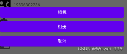 <?xml version="1.0" encoding="utf-8"?> <LinearLayout xmlns:android="http://schemas.android.com/apk/res/android"android:layout_width="match_parent"android:layout_height="match_parent"android:orientation="vertical"><Buttonandroid:id="@+id/take_photo_btn"android:text="相机"android:layout_width="match_parent"android:layout_height="wrap_content"/><Buttonandroid:id="@+id/select_photo_btn"android:text="相册"android:layout_width="match_parent"android:layout_height="wrap_content"/><Buttonandroid:id="@+id/getOut"android:text="取消"android:layout_width="match_parent"android:layout_height="wrap_content"/> </LinearLayout>
