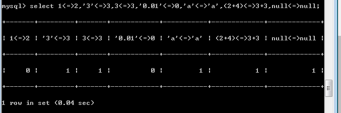 这个符号具备和=号同样的功能,唯一的不同就是可以用来判断NULL的值,在两个操作数均为null的时候,返回值为1而不是null,有一个操作值为null时,返回值为0.