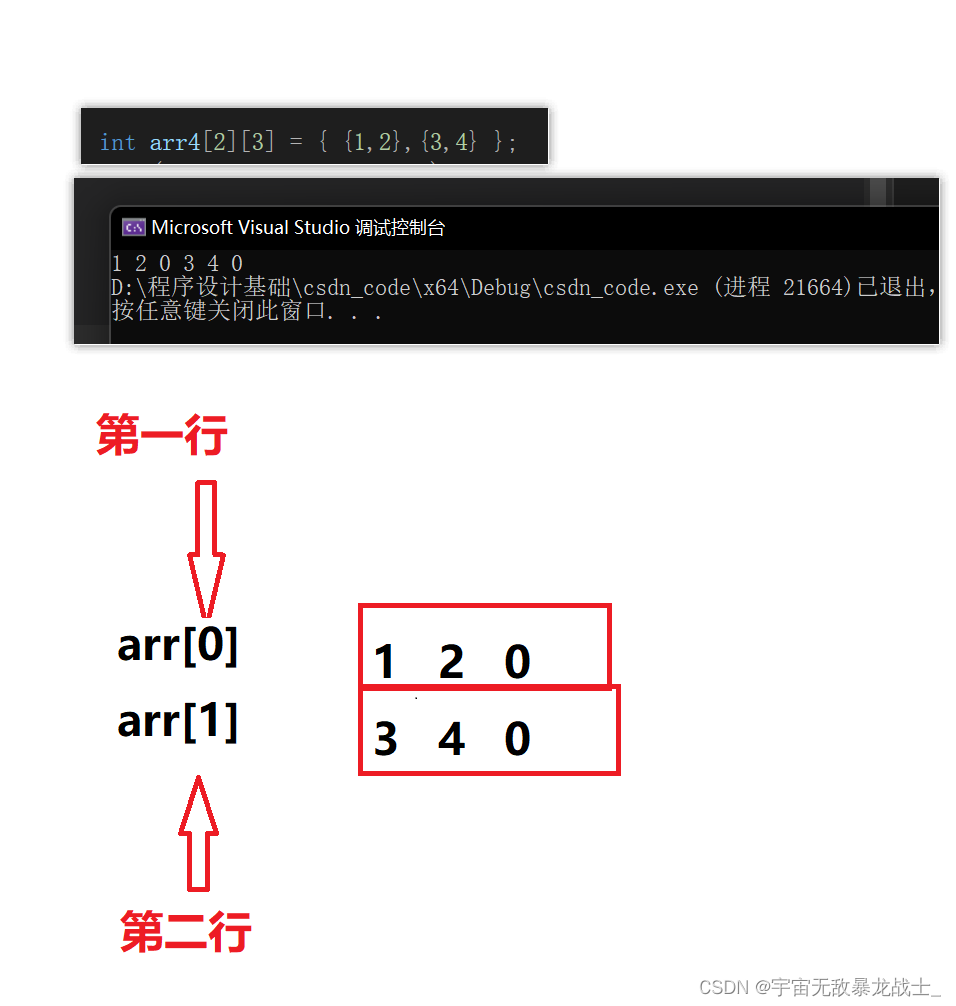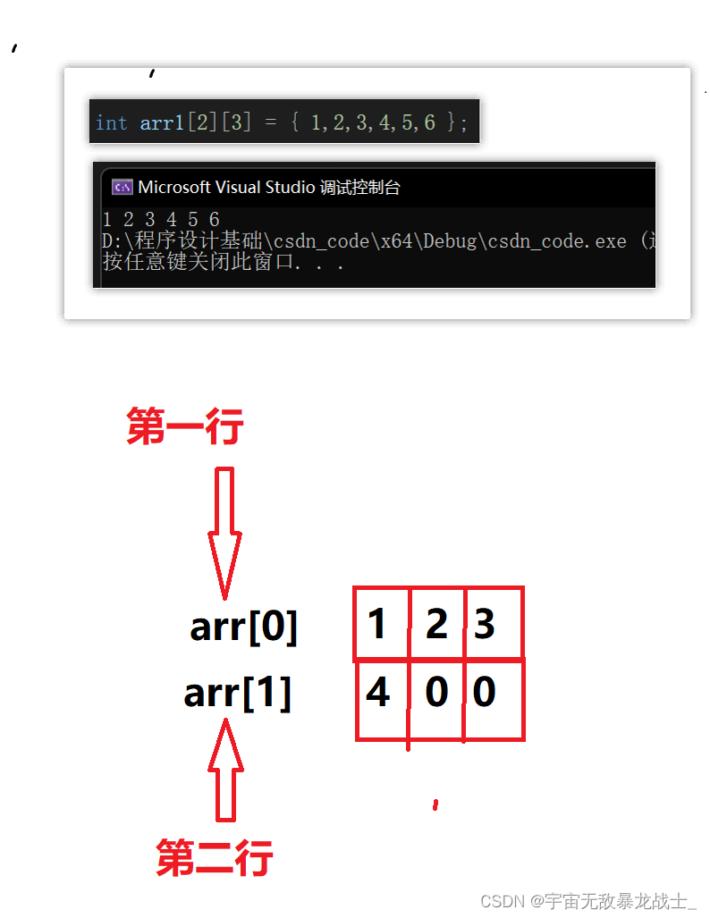 大括号里面,可以看出两个一维数组,分别是第一行和第二行,剩余部分直接赋值为0。