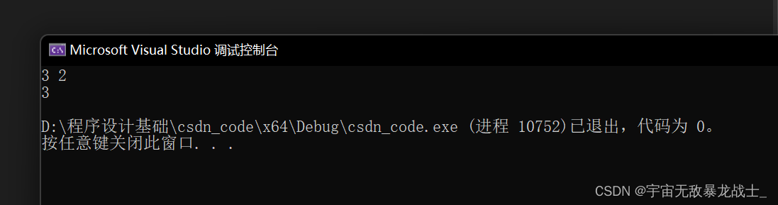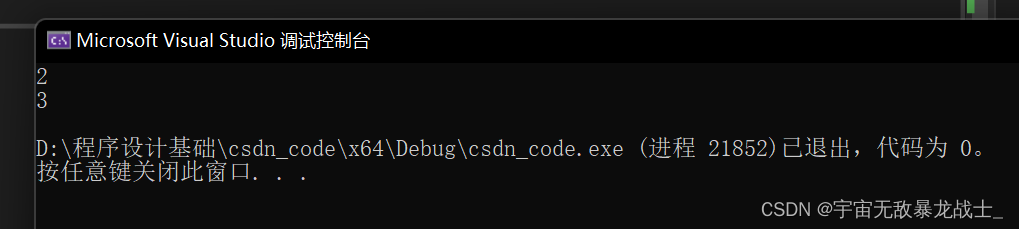 #define _CRT_SECURE_NO_WARNINGS #include<stdio.h> int main() {int a = 0;int b = 2;a = b++;printf("%d\n", a);printf("%d\n", b);return 0; }