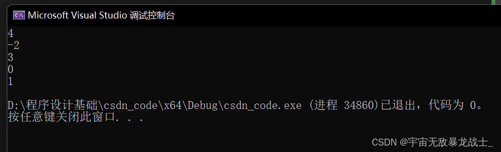 #define _CRT_SECURE_NO_WARNINGS #include<stdio.h> int main() {int a = 1, b = 3, c;c = a + b; //加法printf("%d\n", c);c = a - b; //减法printf("%d\n", c);c = a * b; //乘法printf("%d\n", c);c = a / b; //除printf("%d\n", c);c = a % b; //取余printf("%d\n", c);return 0; }