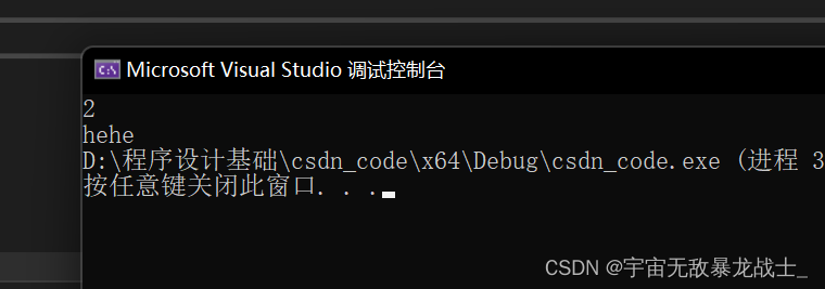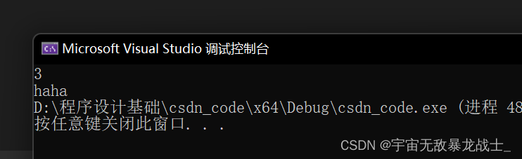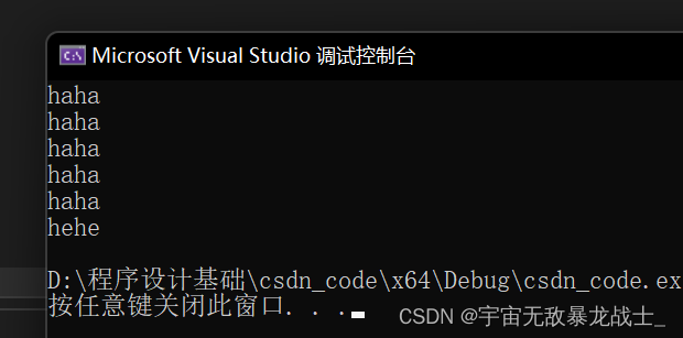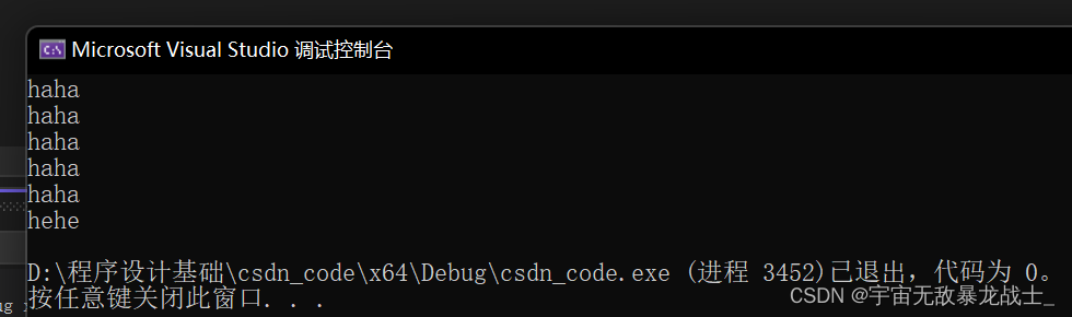 #define _CRT_SECURE_NO_WARNINGS #include<stdio.h> int main() {int n = 5; while (n) //当n等于0时结束循环,因为0本身为假{printf("haha\n"); //每循环一次打印一次hahan--; //n自减1}printf("hehe\n"); //循环结束打印hehereturn 0; }