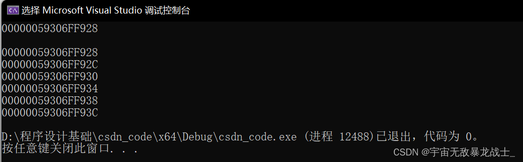 #define _CRT_SECURE_NO_WARNINGS #include<stdio.h> int main() {int arr[] = { 1,2,3,4,5,6 };int* p = &arr[0]; //定义指针变量 p,并把首元素地址赋予 p 中,(指针就是地址,后面会讲)printf("%p\n", arr); //打印数组首元素地址printf("\n");for (int i = 0; i < 6; i++) //创建临时变量i,用于找到其他元素地址{printf("%p\n", (p + 1*i)); //用首元素地址找到其他元素地址}return 0; }