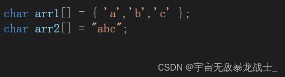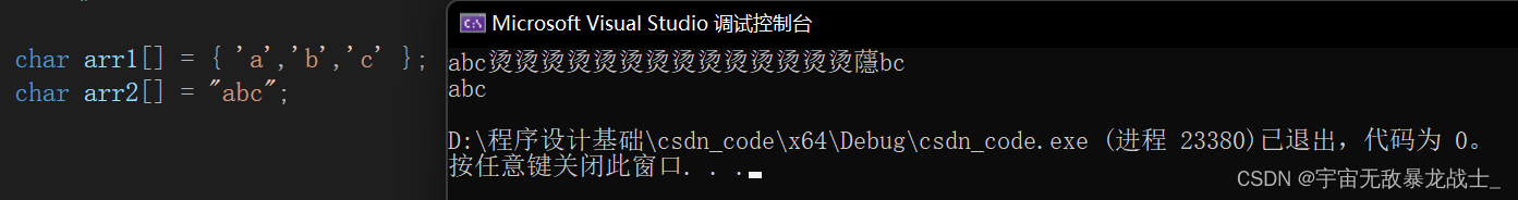 因为数组arr1中无转义字符\0所以不会停止打印,该数组后面内存地址是未知的,打印出来的是随机数。数组arr2中字符串末尾会自动包含一个转义字符\0,所以会停止打印。