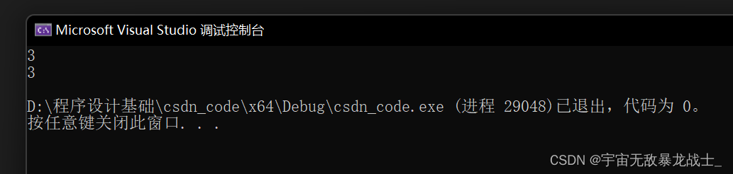 #define _CRT_SECURE_NO_WARNINGS #include<stdio.h> int main() {int a = 0;int b = 2;a = ++b;printf("%d\n", a);printf("%d\n", b);return 0; }