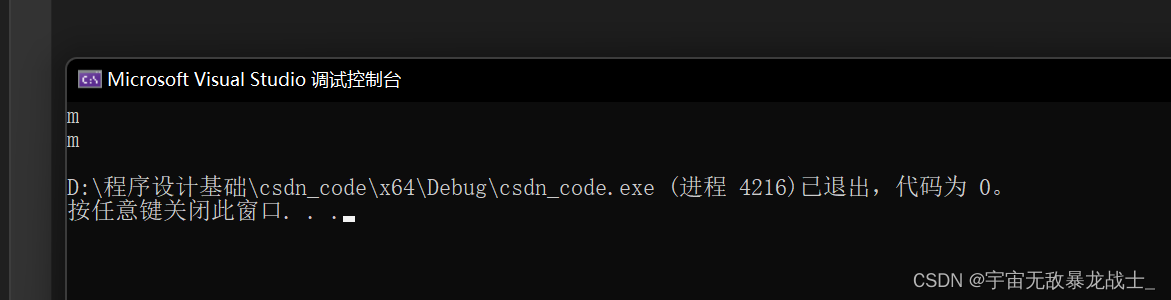 #define _CRT_SECURE_NO_WARNINGS #include<stdio.h> int main() {char a, b; //定义字符型变量a = 'm'; //对字符变量a赋值b = 'n'; //对字符变量b赋值printf("%c %c\n", a, b); //%c用来打印字符return 0; }