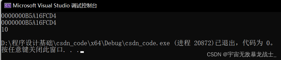 #define _CRT_SECURE_NO_WARNINGS #include<stdio.h> int main() {int a = 10; int* p = &a; //创建指针变量p,并把a的地址赋给p,&是取地址符printf("%p\n", &a); //打印a的地址printf("%p\n", p); //打印p的地址printf("%d\n", *p); //打印p的地址对应的内容,*p表示解应用p return 0; }