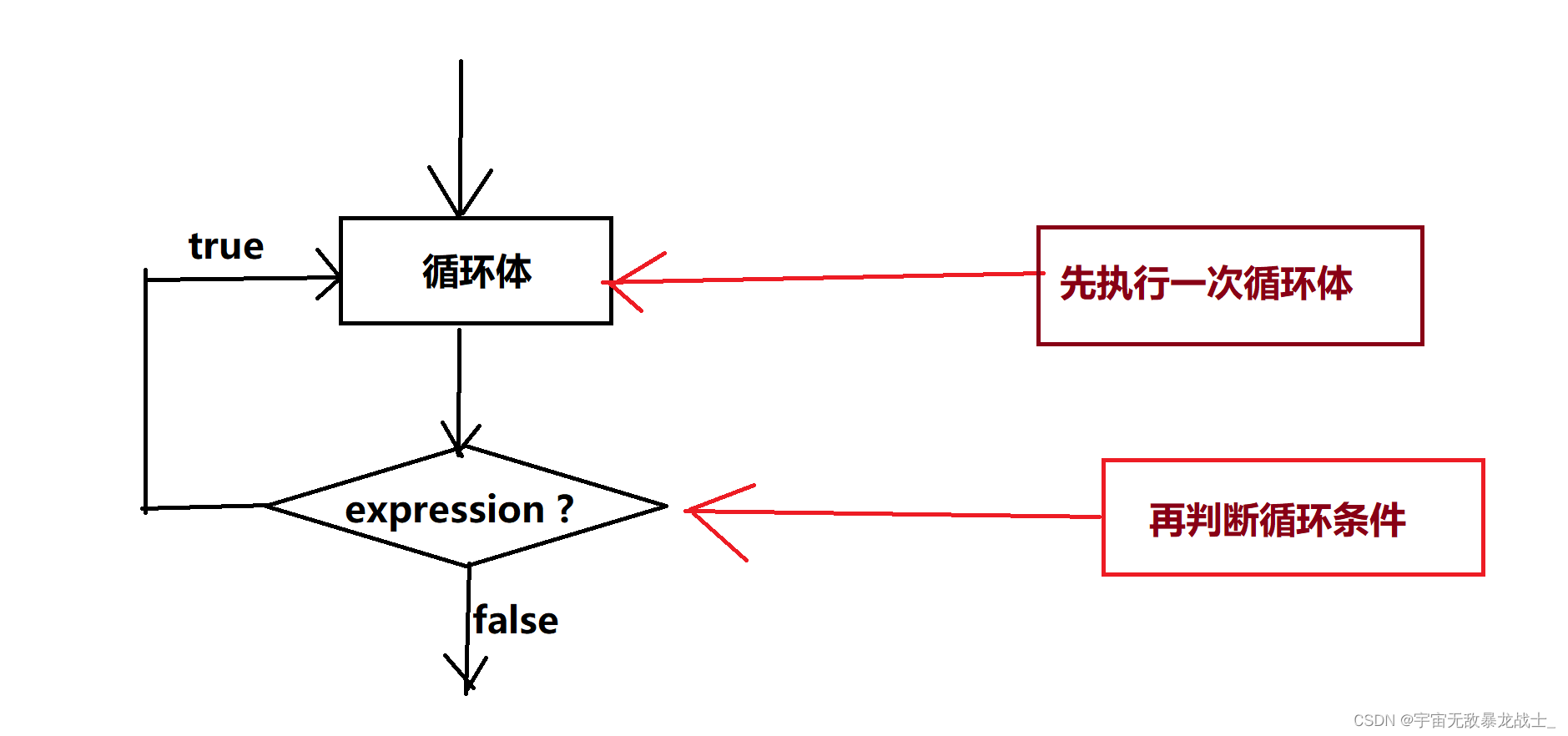 如图:不同于while语句,do-while语句是先执行一次循环体后在进行循环条件的判断。简单来说就是”先做后判“,而while语句是”先判后做“。