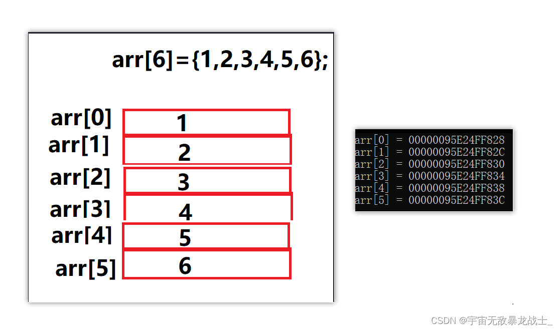 数组名arr表示该数组首元素地址,所以我们可以通过首元素地址找对数组中其他元素地址。