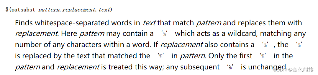 patsubst可以在pattern与replacement中使用通配符%。通配符作用于每一个分割后的子字符串t1 t2 t3....里。通配符可以代表任何数量的任何字符。replacement中也可以使用%。假如匹配成功,replacement中的%应该被pattern里%的内容取代。