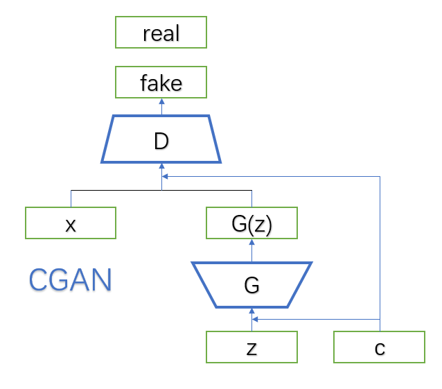 如下图所示,我们在输入噪声z时,额外加上一个限制条件condition,z和c通过生成器G得到生成的图片