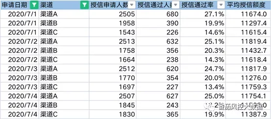 5)分析角度:授信通过率和平均额度的高低能反应新客的质量,像优质渠道的通过率和额度都会比较高,另外也需要关注每天的申请人数,能反应渠道拉新的情况,以及业务对新客运营的策略方向。