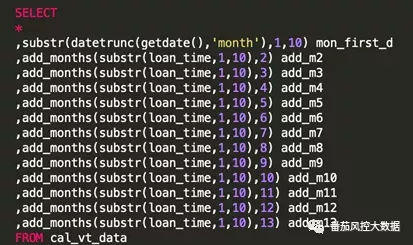 sql开发逻辑:第一步:报表是以放款月作为维度的,且反映资产随着时间的坏账滚动变化,所以这边先计算当前日期(后续算逾期天数要用到),并利用add_months函数算出放款时间后面的月份滚动字段,add_m2代表+2个月(因为这里坏账的定义是逾期天数>30天,所以第一期出账至少在2个月以后)。