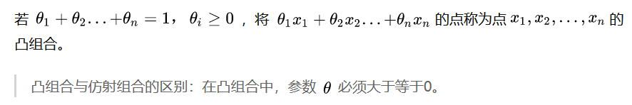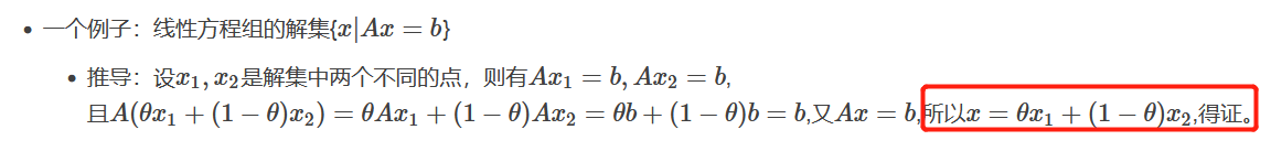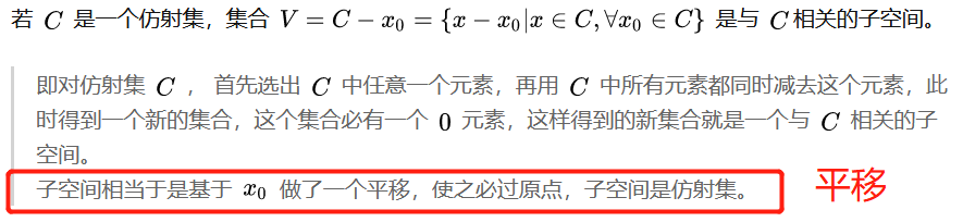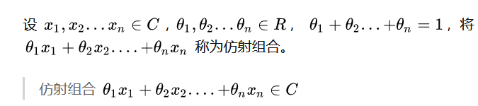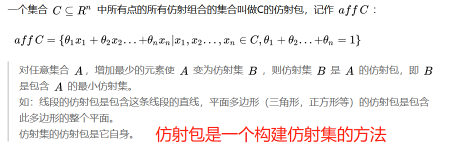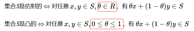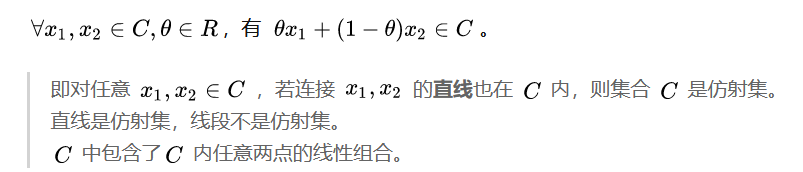①仿射集的概念:一个集合是仿射集,当且仅当集合中经过任意两点的直线(而不是线段)上的点仍在集合中。
