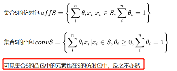 都是对集合本身性质的描述,但是有所不同,否则就拥有一样的名字了,不同点就在于数值的取值范围:仿射集对集合的要求包括了凸集对集合的要求,因此可以说仿射集比凸集要求更高,不仅要满足凸集的定义(