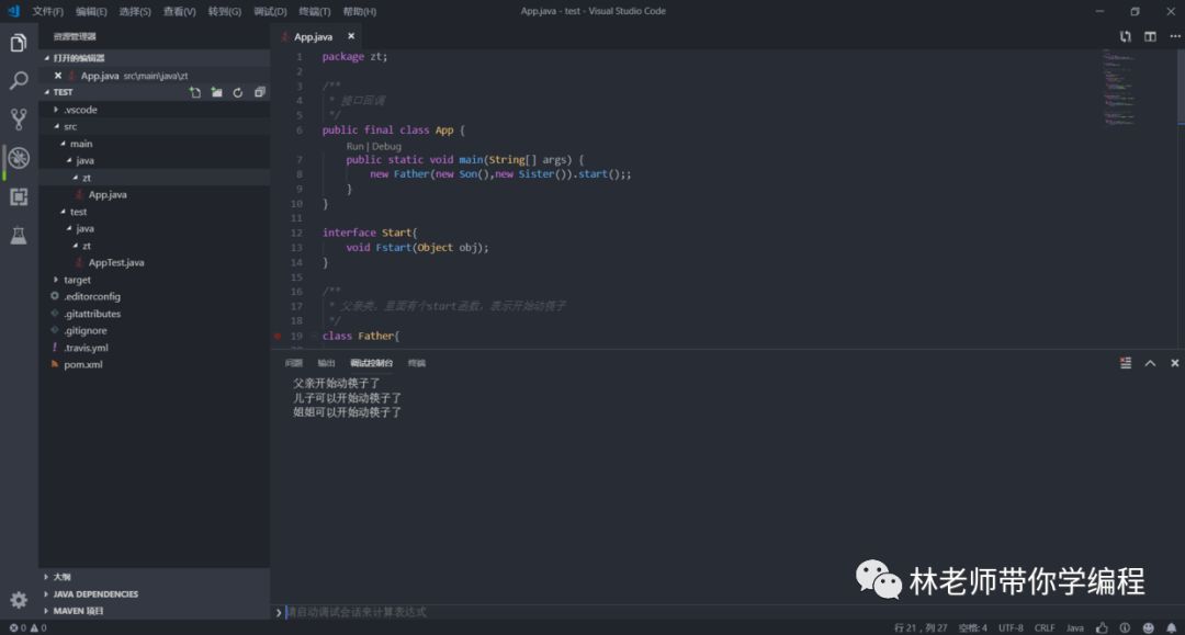 class Sister implements Start{private void start(){System.out.println("姐姐可以开始动筷子了");}@Overridepublic void Fstart(Object obj) {if(obj.toString().equals("父亲动了筷子")){start();}}