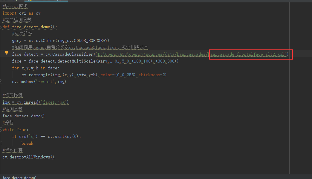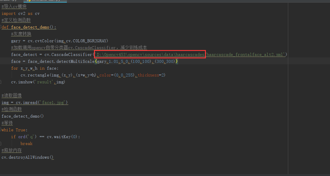 def face_detect_demo():#灰度转换gary = cv.cvtColor(img,cv.COLOR_BGR2GRAY)#加载调用opencv自带分类器cv.CascadeClassifier,减少训练成本face_detect = cv.CascadeClassifier('D:/Opencv453/opencv/sources/data/haarcascades/haarcascade_frontalface_alt2.xml')#调用函数,后两个参数表示检测的矩形范围。face = face_detect.detectMultiScale(gary,1.01,5,0,(100,100),(300,300))#绘制检测范围for x,y,w,h in face:cv.rectangle(img,(x,y),(x+w,y+h),color=(0,0,255),thickness=2)cv.imshow('face_detect',img)