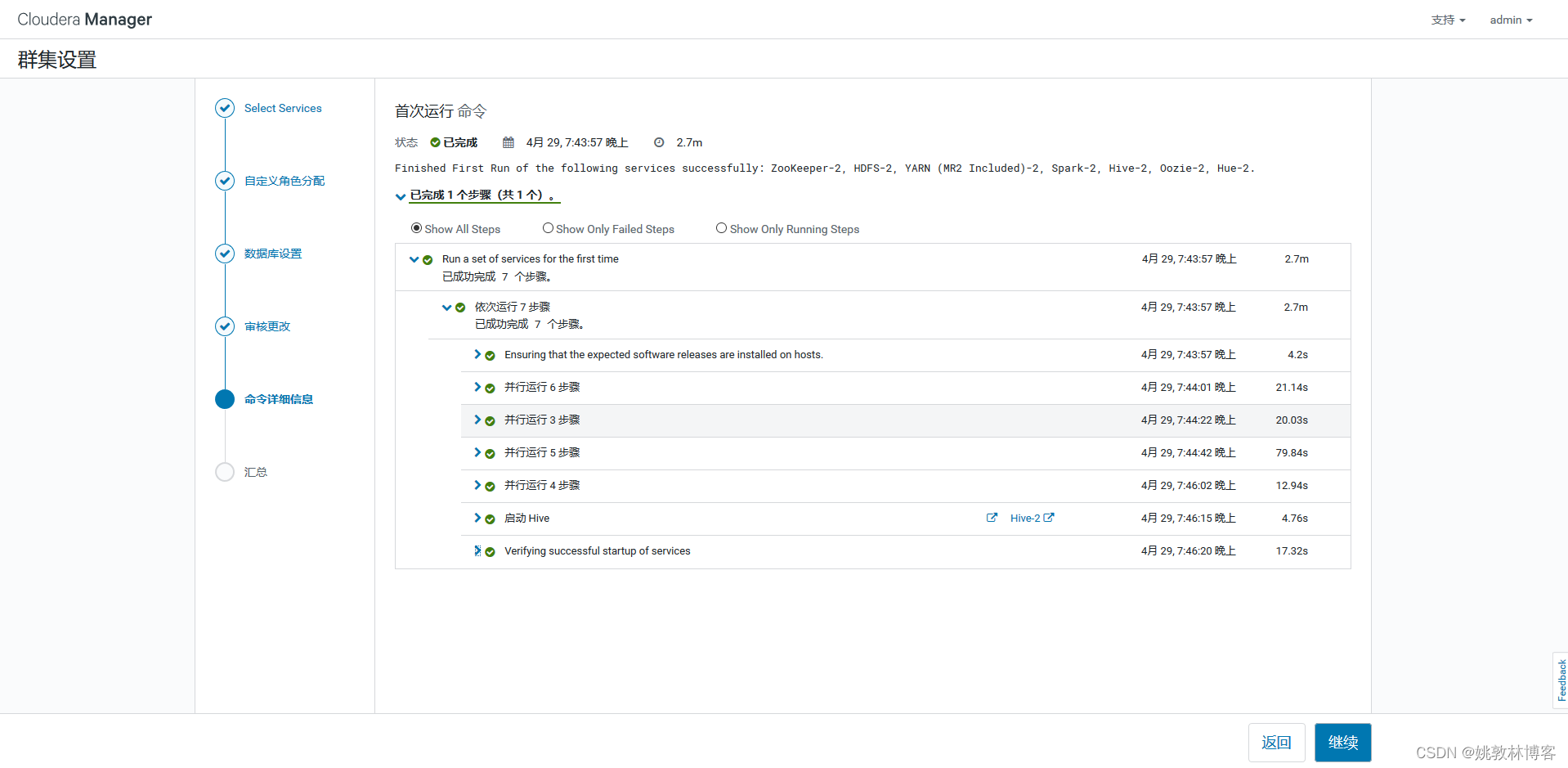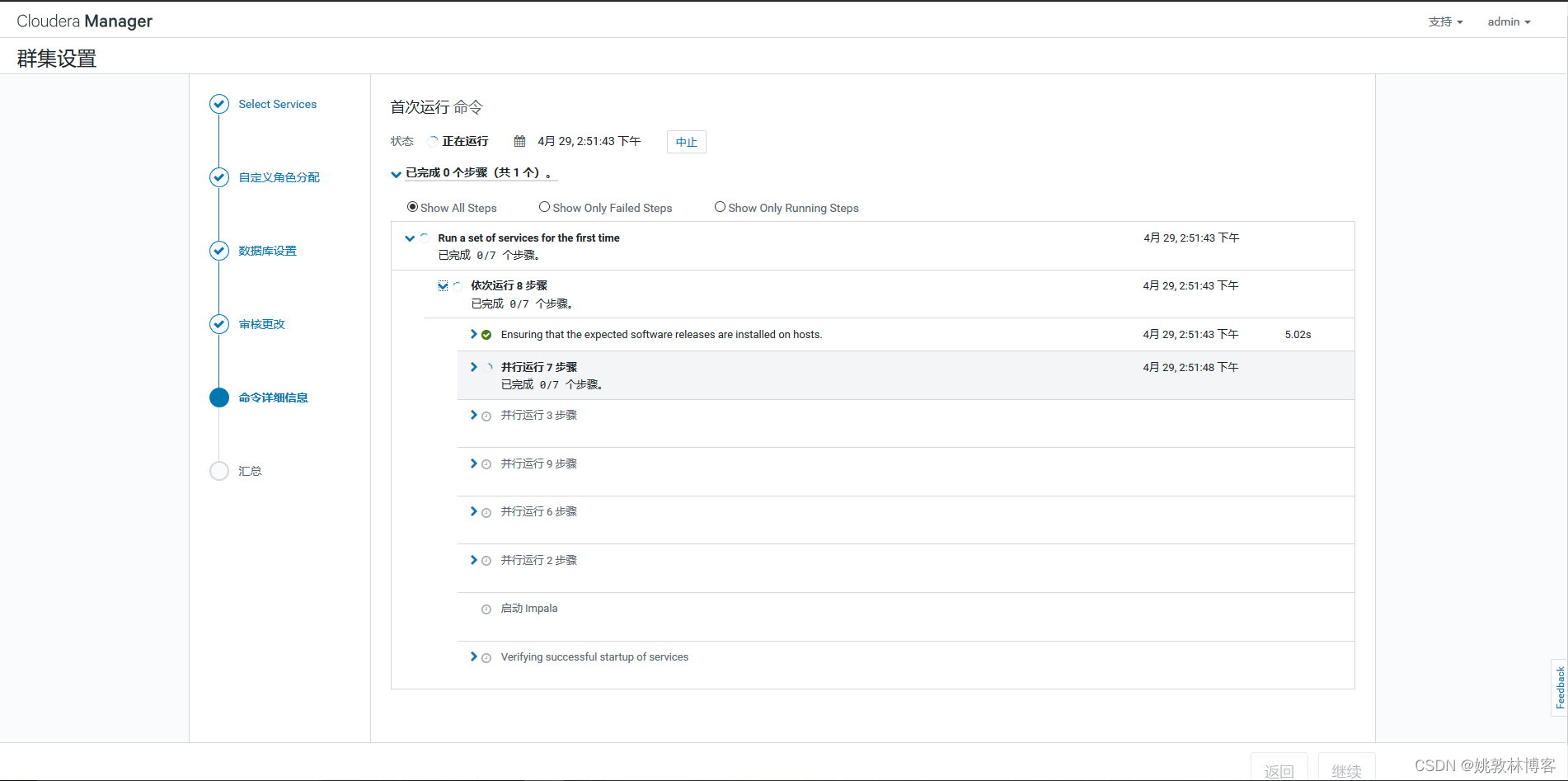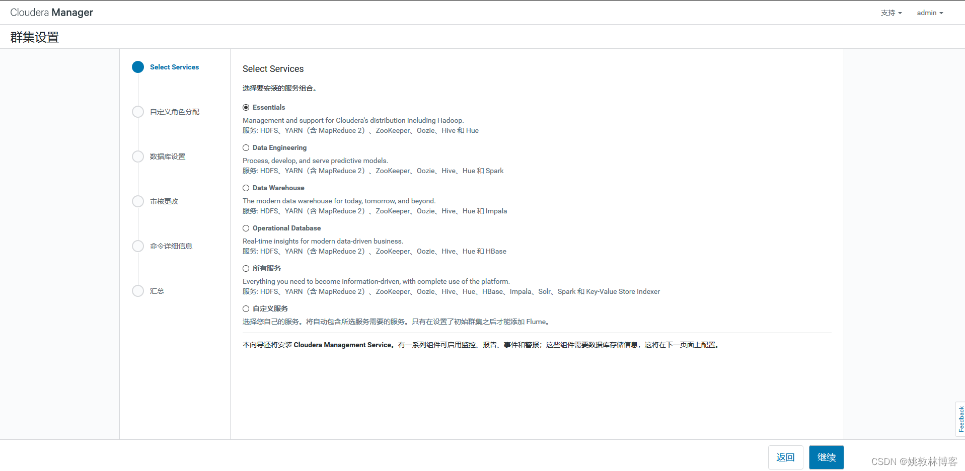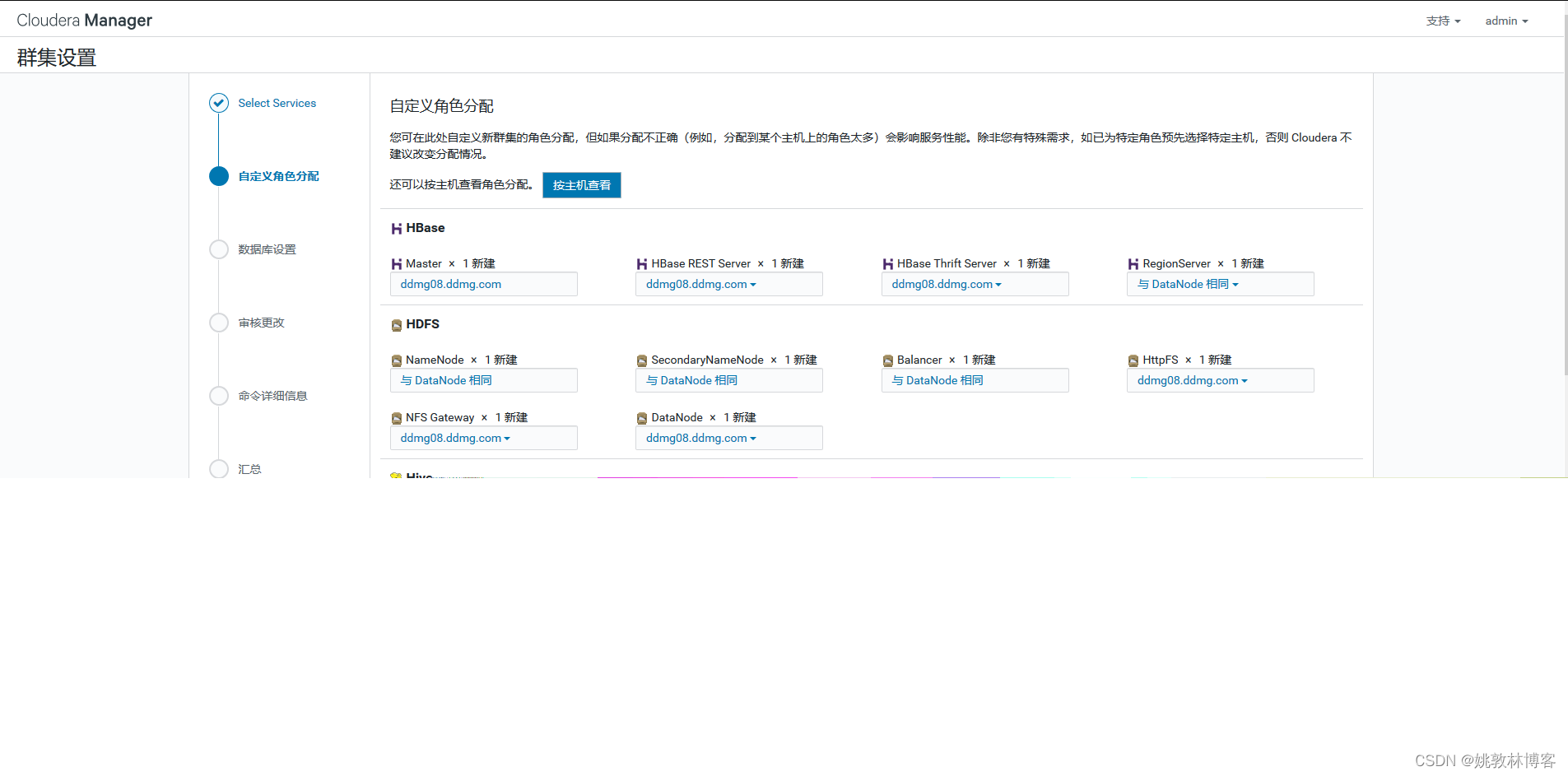 如果慢的话,下载需要两天,有的网络可能会快一些。等cloudera manager server将parcels下载完毕并部署到所有的cdh集群后,就可以选择你需要安装的大数据服务了(hadoop,spark,kafka,hbase等),然后分配每台主机的角色。