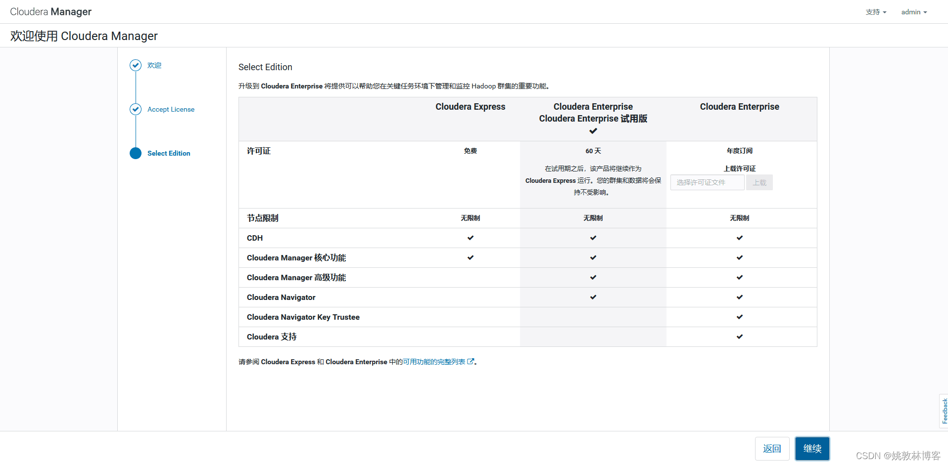 下面打开浏览器访问到clodera manager server的站点,登录进去,默认的用户名和密码都是admin。同意协议并点下一步,如果让选择cdh的lisence版本,就选免费版的(最左边)。然后你将会看到下面这个图片