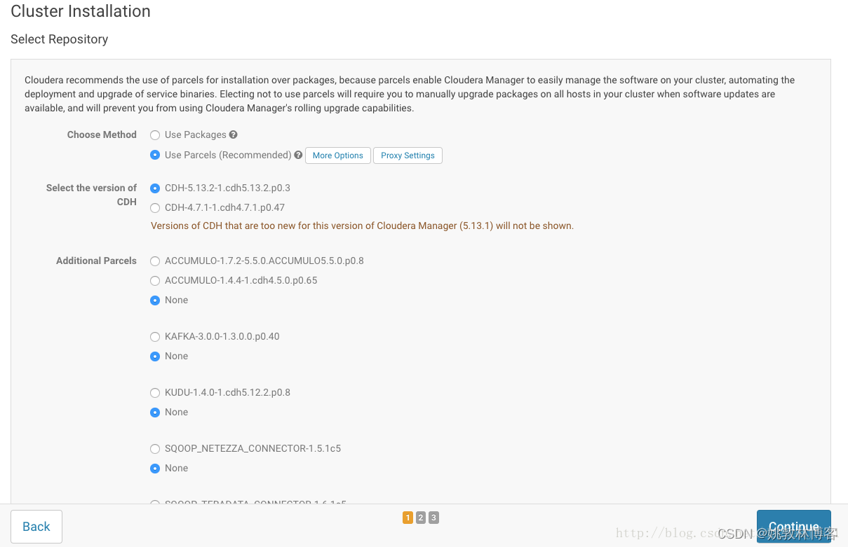 选择more options,在Remote Parcel Repository URLs中,将{latest_supported}修改为你安装cloudera-manager-server的版本(如5.13.1)。其余的保持默认就行,一定要用parcels的方式,也是cdh推荐的方式。然后继续。就会开始下载并部署parcels。