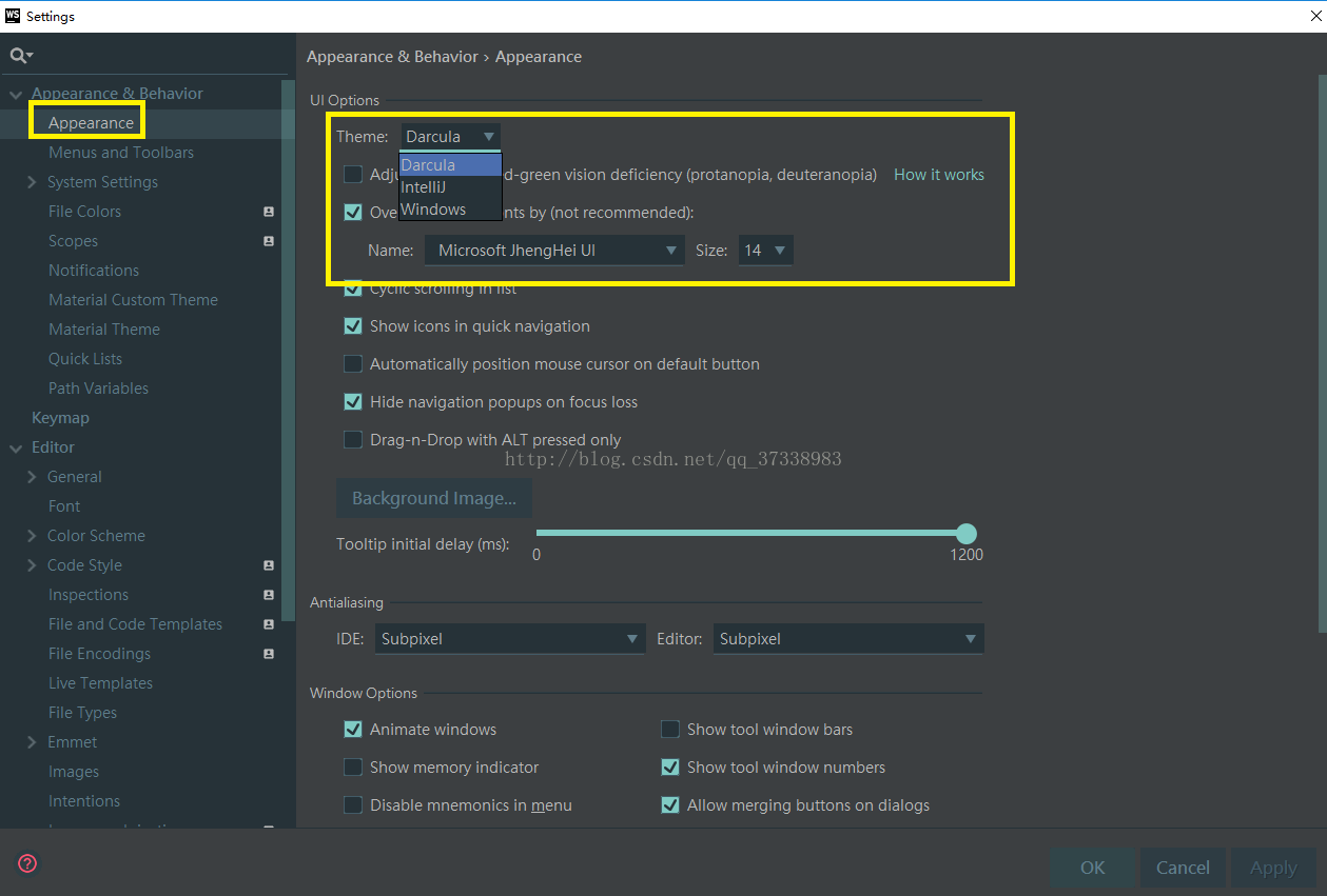 主题:File->Setting->Appearance & Behavior,如下图,里面有三种主题可供选择,还有左侧菜单栏的格式设置