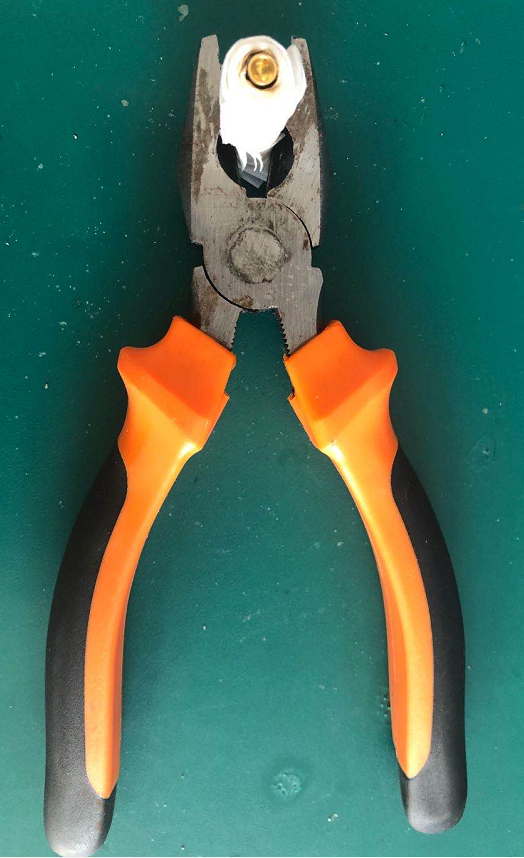 香蕉头用纸巾包裹好,夹在老虎钳上。用纸巾的目的是防止焊锡里面的松香融化后流到插头部分,会造成接触不好。焊接时先将焊锡融入香蕉头内并填满,然后再插入电机线。如下图所示: