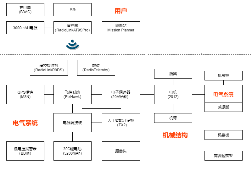 根据以下框图,今天进行了大疆F450无人机硬件部分的组装,全过程参考了:图文并茂详细教程之–用pixhawk飞控组装一台F450四轴无人机