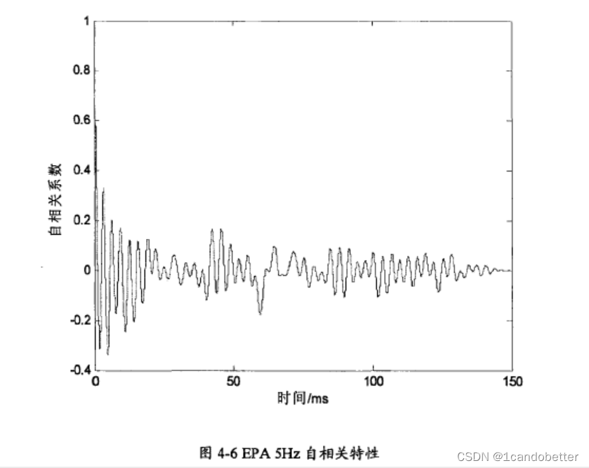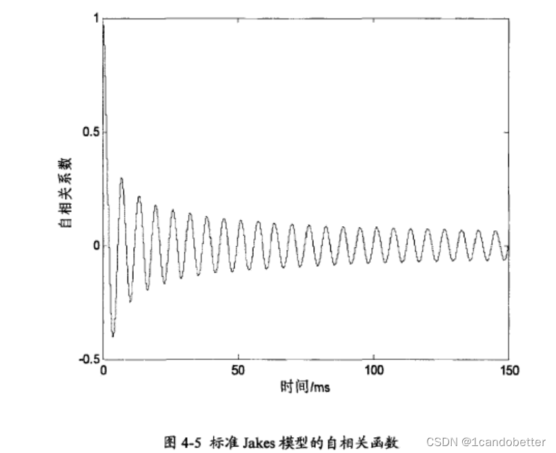 理论上Jakes模型的自相关函数表征时域信号的自相关特性,标准Jake模型的一阶贝塞尔函数如图4-5所示,可以看到0点的自相关为1,随着自身延时的增大,自相关特性呈现波动下降趋势,直至趋近于0。曲线纵坐标第一次到达0点所对应的横坐标值是时间和多普勒频移的乘积,这即为该信道相干时间。 EPA, EVA等信道模型可以利用Jakes模型产生的多径合并瑞利信道从理论上应该近似为Jakes模型。