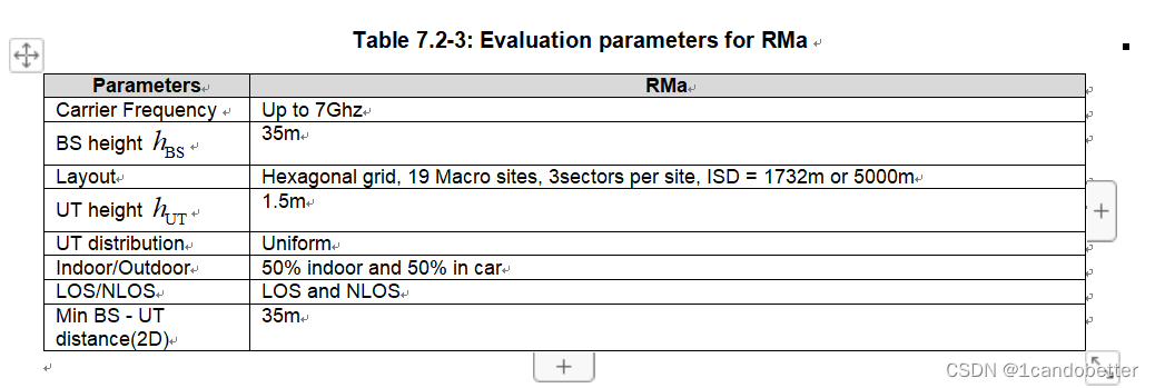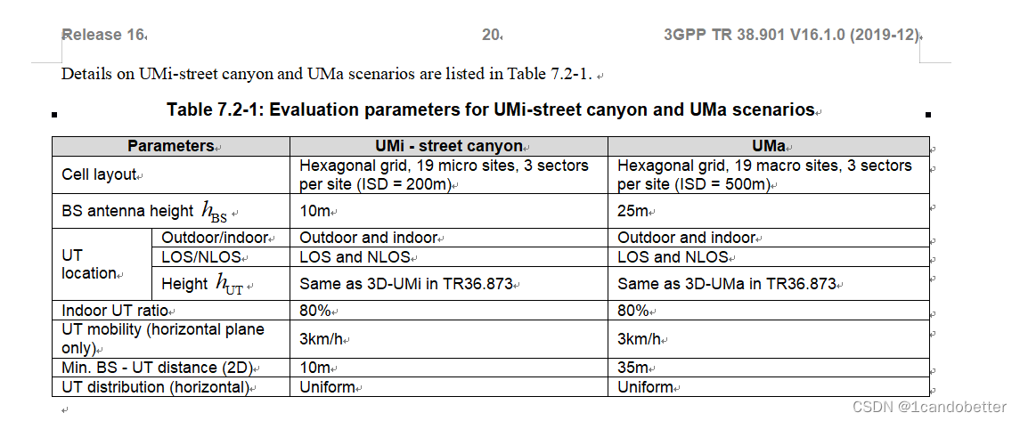 这种场景的特性为较大的小区半径,较高的基站天线位置(保证较大的覆盖范围),移动台位于室外的街道环境或者室内,天线高于屋顶,高度在10~80m之间,通常为35m,中到高的时延扩展,低的角度扩展以及较高的移动性。网络的拓扑结构采用的是传统的3扇区6边形蜂窝小区。