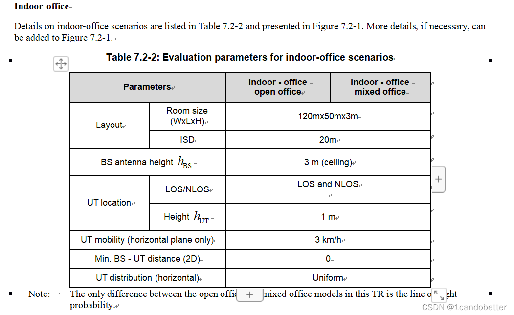 室内场景是目前数据业务应用的主要场景。该场景的主要特征是数据的高吞吐量和高用户密度。包括办公环境和购物中心。典型的办公环境包括开放式隔间区域、有围墙办公室、开放式区域、走廊等。BSs安装在天花板或墙壁上2-3米的高度。购物中心通常有1-5层高,可能包括一个开放区域。BSs安装在走廊和商店的墙壁或天花板上,高度约为3米的高度。