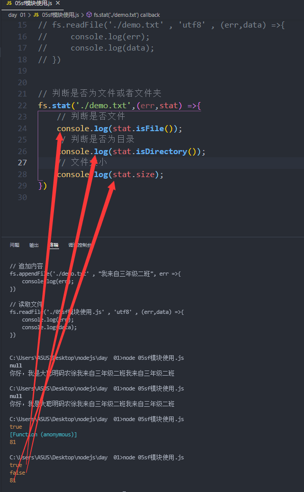 fs.stat('目标文件或者文件夹' ,(err,stat)=>{ console.log(stat.isFile()); //是否文件 console.log(stat.isDirectory()); //是否是目录 console.log(stat.size); //128字节 }) | 判断文件是否是文件或着文件夹 |