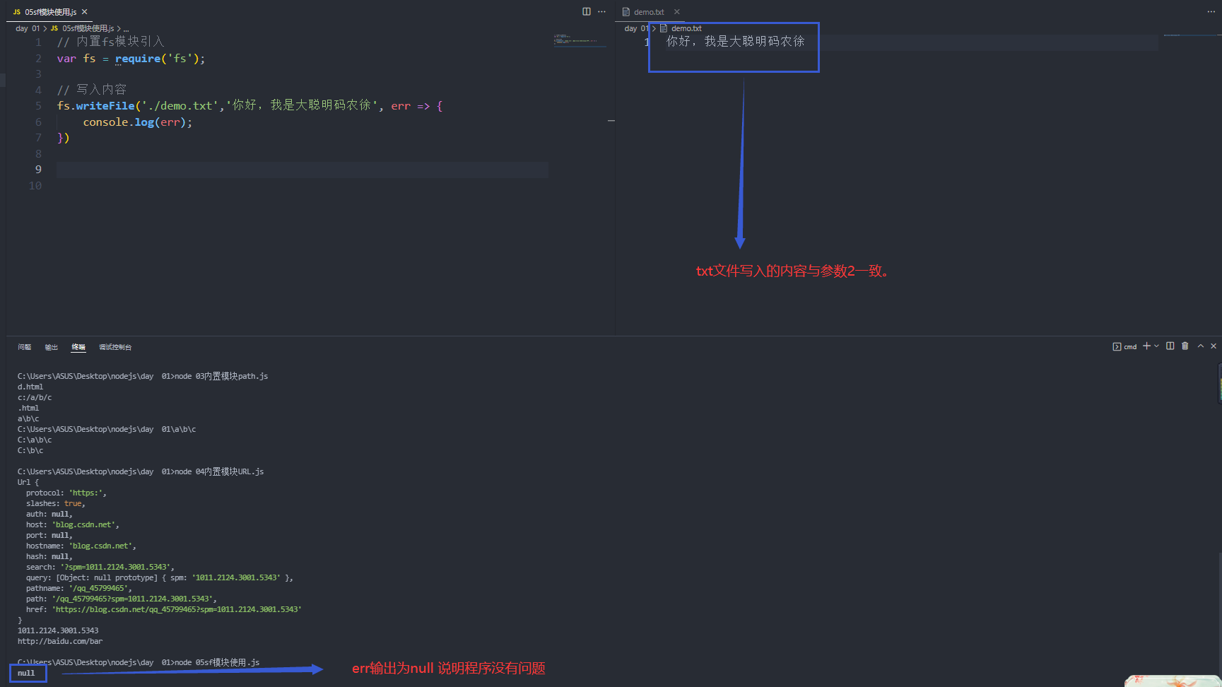 fs.writeFile(参数1,参数2,参数3); 参数1 目录 参数2 内容 参数3 err回调 | 写入内容 |