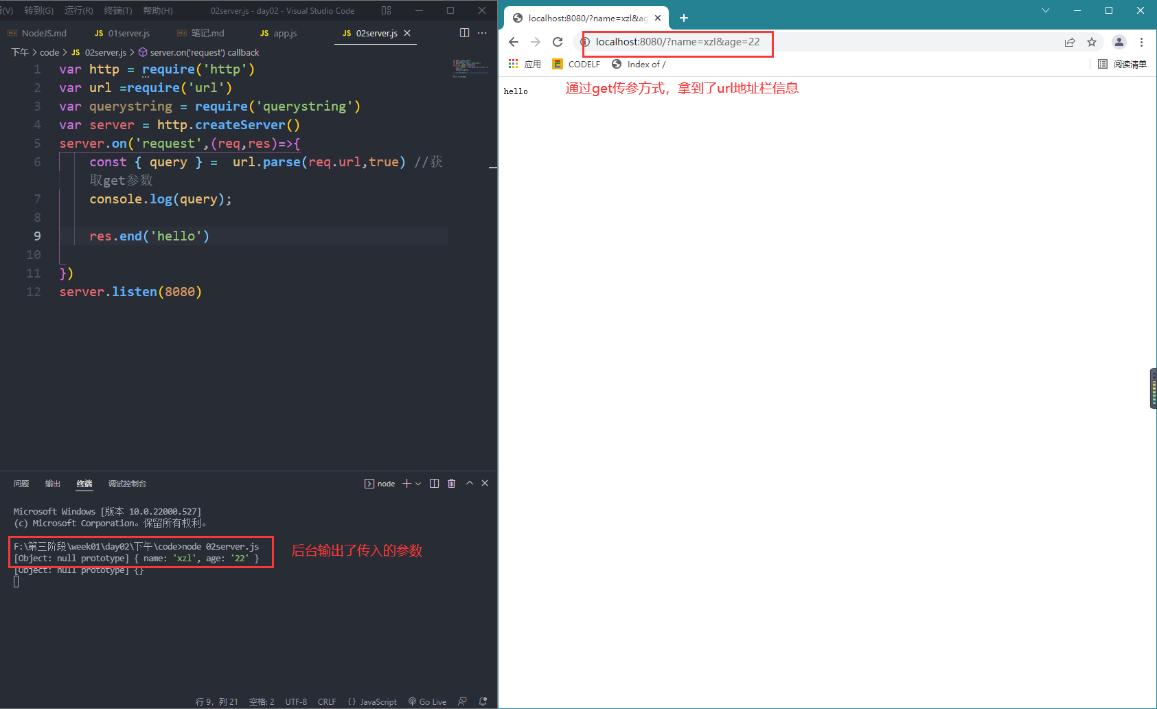 server.on('request',(req,res)=>{const { query } = url.parse(req.url,true) //获取get参数console.log(query);res.end('hello')})