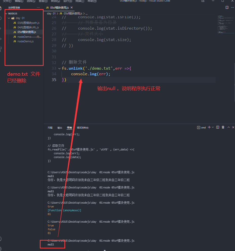 fs.unlink(参数1,参数2); 参数1 目录 参数2 错误回调 | 删除文件 |