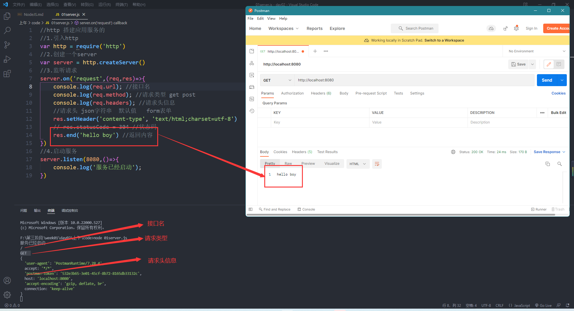 server.on('request',(req,res)=>{console.log(req.url); //接口名console.log(req.method); //请求类型 get postconsole.log(req.headers); //请求头信息//请求头 json字符串 默认值 form表单res.setHeader('content-type', 'text/html;charset=utf-8')// res.statusCode = 304 //状态码res.end('hello boy') //返回内容