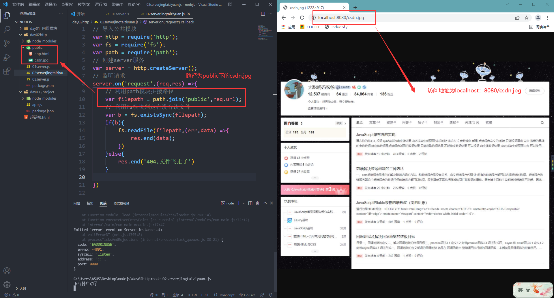 server.on('request',(req,res) =>{// 利用path模块拼接路径var filepath = path.join('public',req.url);// 利用fs模块判定有没有该文件var b = fs.existsSync(filepath);if(b){fs.readFile(filepath,(err,data) =>{res.end(data);})}else{res.end('404,文件飞走了')}})server.listen(8080,()=>{console.log('服务器启动了');